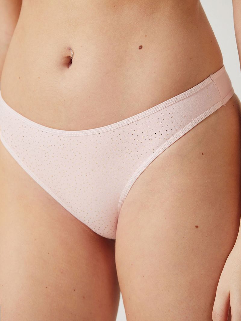 La bombacha Camille Rosa Navidad combina suavidad y brillo en una prenda festiva y cómoda. Vedetina, confeccionada en algodón y lycra estampada con delicados detalles en foil dorado, aporta un toque luminoso y femenino. Ideal para usar todos los días o para sumar un estilo especial en las fiestas.